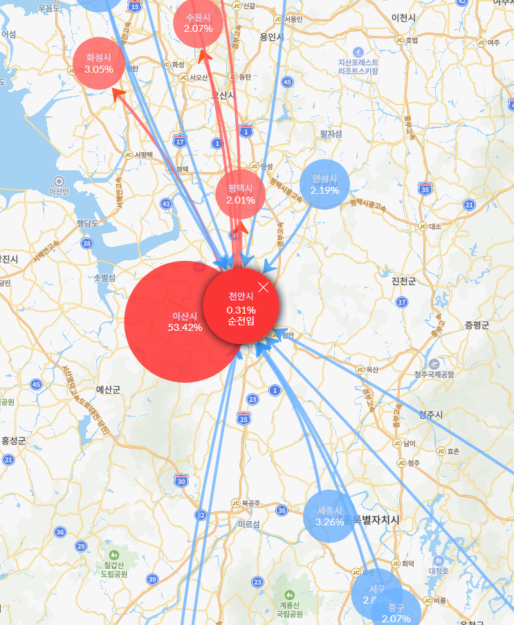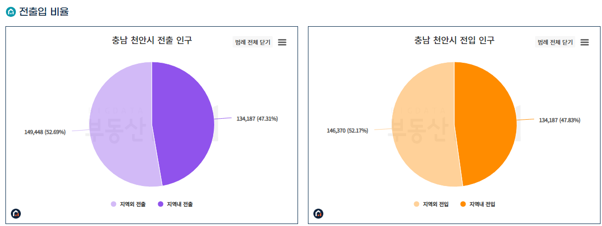삼성 천안 사업장 등 대기업이 위치하고 있으므로, 타 지역에서 일자리 수요로 인한 인구 유입을 생각해 볼 수 있겠습니다.