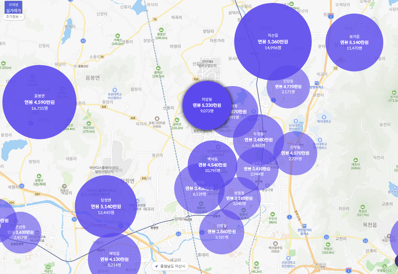 조금 더 확대하여 보겠습니다. 성거읍/직산읍/차암동/성성동/백석동/아산시 탕정면 등이 종사자수/연봉수준이 높은 동네로 보입니다.