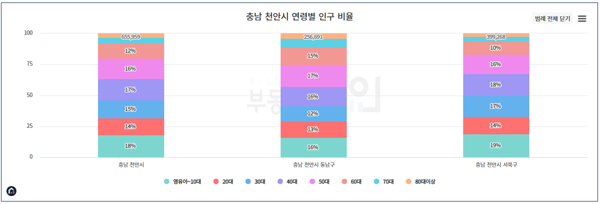 우선 확인되는 부분이 비수도권 지역 중 인구가 세 번째로 많은 도시라는 점입니다. 인근 아산신도시 생활권이 천안에 종속되어 실질 인구가 더 많다는 점도 확인해 볼 부분이겠네요.
