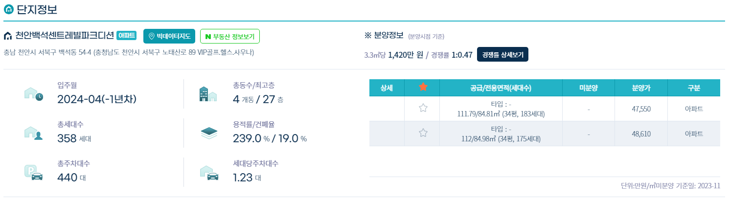 | 아파트 | 천안백석센트레빌파크디션 | 충남 천안시 서북구 백석동 54-4 | Apr-24 | 358 | 0 | 1,420 | 동부건설(주) | O |