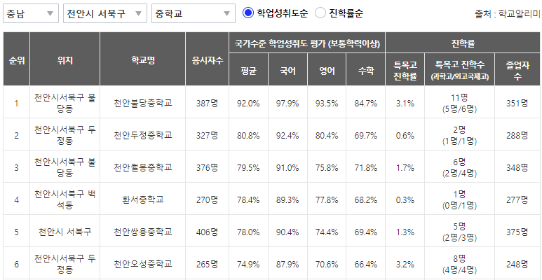 천안시 학군지(학업성취도/학원가)가 어딘지 확인해 볼까요?