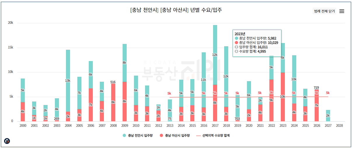 우선 천안시 수요/입주 공급물량을 확인해 봅니다.